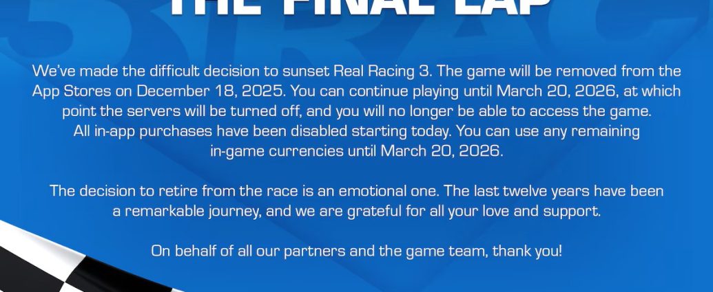 Namun, pada Disember 2025 lalu , Real Racing 3 telah dikeluarkan dari App Store dan Google Play dengan EA mengumumkan bahawa pelayan permainan ini akan ditutup sepenuhnya pada 20 Mac 2026 ini.