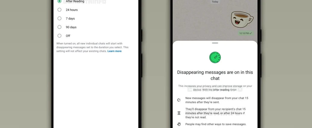 Dengan kemas kini akan datang, WhatsApp bakal memperkenalkan pilihan tetapan masa “selepas dibaca”. Apabila diaktifkan, mesej akan menghilang 15 minit selepas penerima membacanya. Namun, jika mesej tersebut tidak dibaca, ia akan hilang secara automatik daripada perbualan penerima selepas 24 jam.